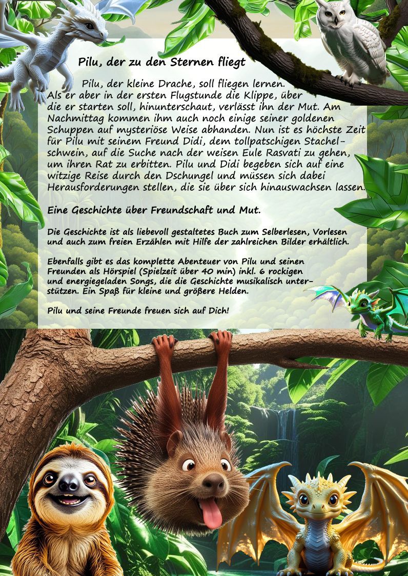 Das Buch "Pilu, der zu den Sternen fliegt" (42 Seiten) ist ab sofort für 9,95 € als digitale Version erhältlich. Sie bekommen einen Downloadlink per Mail zugeschickt und können das Buch im PDF-Format auf Ihrem digitalen Endgerät (PC, Laptop, Tablet, Handy ...) öffnen oder selbst ausdrucken. Sie erhalten bei Bestellung eine Rechnung (Überweisung oder PayPal). Nach Zahlungseingang erhalten Sie den Link.